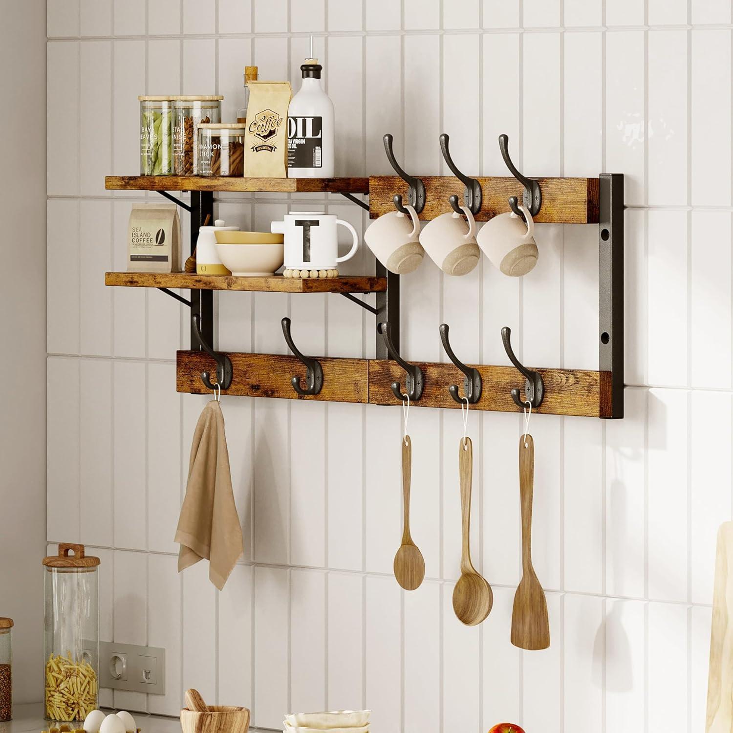 【Multi-purpose Coat Rack】 2 in 1 Wall Mount Coat Rack, both hanging and display function; The two flat shelves are perfect for displaying small items like picture frames, potted plants, or other artwork. The five hooks can be used to hang bags, coats, keys, dog leashes, and more. Vintage brown shelves add a unique rustic or farmhouse look whether installed in an entryway, living room or elsewhere.