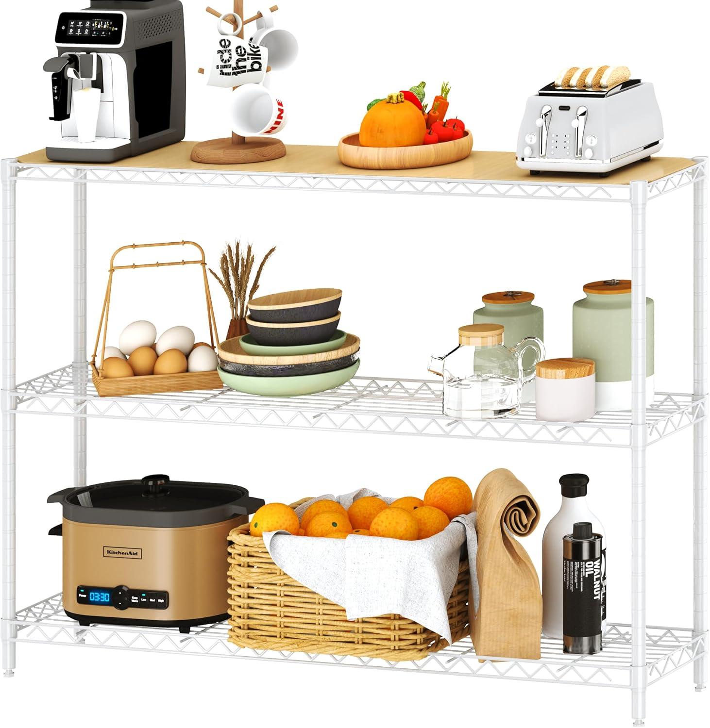 📐【Adjustable Leveling Feet & Customizable Height】 Equipped with adjustable feet for stability on uneven floors; The tier height can be customized to accommodate tall items like microwaves, books, boots, or potted plants