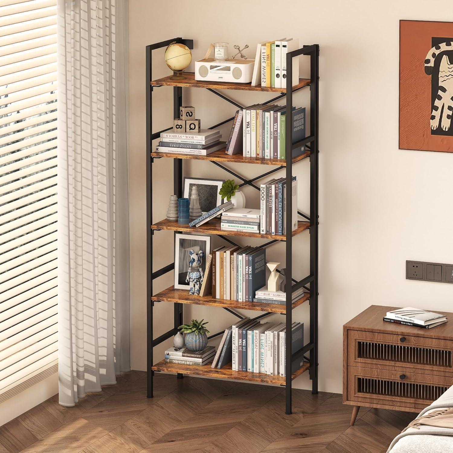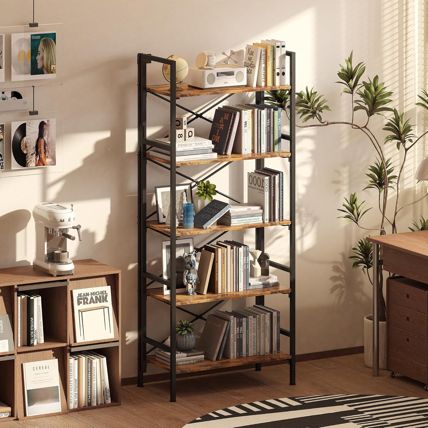 【Modern Minimalist Style】Sleek black metal frame with Brownish wood veneer shelves. Neutral tones blend with any decor—from Scandinavian living rooms to industrial cafes.