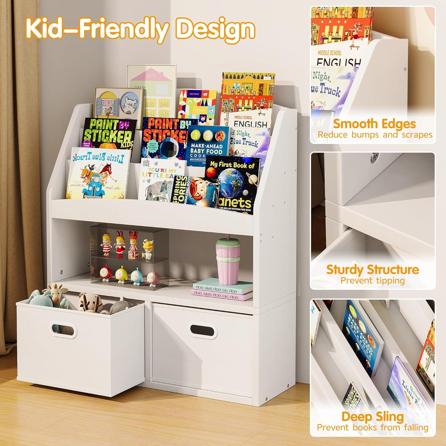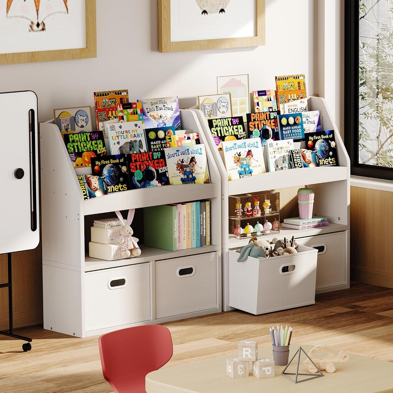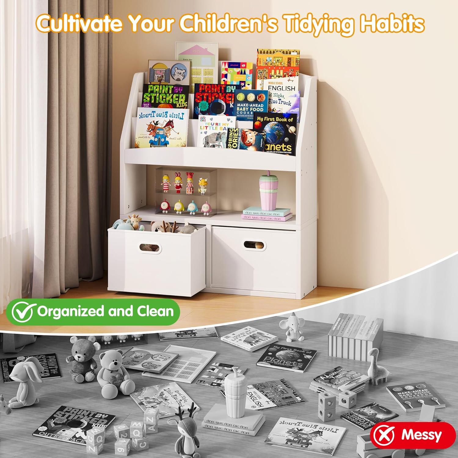 【Ample Storage for Various Needs】Designed to grow with your child, this kids book storage solution offers abundant space for all their essentials. It's not just a baby bookshelf for first books; it's a comprehensive organizer for storybooks, toys, and more, helping to keep their world neat and organized as their collection expands