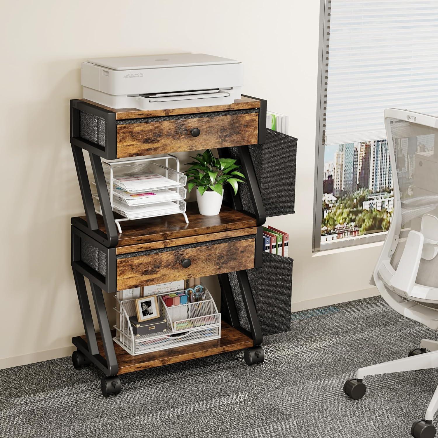 image:imageHomeiju Under Desk Printer Stand 2Tier Industrial Mobile Printer Table with Storage Bag and Drawer Rolling Printer Cart Holder with Lockable Wheels for Home Office